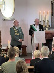 Anlässlich des 450-jährigen Bestehens der St. Heinrich Schützenbruderschaft Bremerberg überreichte Diözesanschießmeister Rudolf Bracht dem Brudermeister Stefan Köhne die Hochmeisterplakette des Bunds der Historischen Deutschen Schützenbruderschaften e. V.
